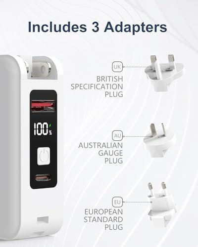 Global Compatibility: Perfect for globetrotters, portable power bank comes with UK, Australia, and Europe plug adapters. No matter where your travels take you, keep your devices charged and ready with this versatile and compact charger.