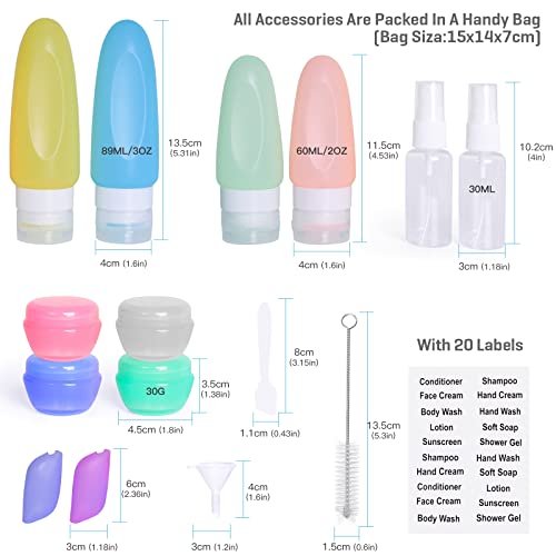 ✈️Travel bottle set for Toiletries: A classical travel size toiletries set and you get 4 silicone travel bottles (2 *3oz + 2 *2oz) + 2 spray bottles (30ml) + 4 cream jars (20ml) + 2 Toothbrush covers + 1 clean brush + 1 label + 1 scooper + 1 funnel + 1 PVC bag
