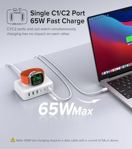 【USB C Fast Charging Station】This is a trendy multi-port USB C charger that can simultaneously charge 6 devices. Single-port USB C1/USB C2 can output up to 65W, and it only takes 2.5 hours to fully charge for MacBook Pro 16″. When using USB C1 and USB C2 at the same time, USB C2 outputs 20W Max, Super fast charging for your phone. USB C3 (Max 20W, PD3.0) and 3 x USB A (Max 18W, QC3.0) ensure the best charging effect for mobile phones, watches, earphones.