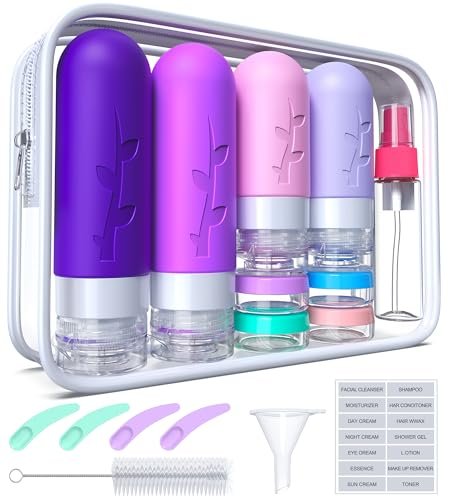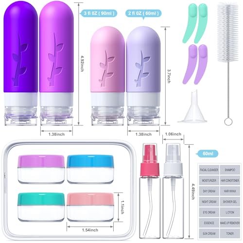 【Travel Essentials】Aeomni 16 pcs travel size toiletries set includes 1 transparent waterproof storage bag, 2 large silicone travel bottles (3oz/90ml), 2 small silicone travel bottles (2oz/60ml), 2 spray bottles (1oz/30ml), 4 cream boxes (0.34oz/10ml), 1 funnel, 1 cosmetic label, 1 cleaning brush and 2 cosmetic spatulas. Enough to accommodate all your travel necessities!