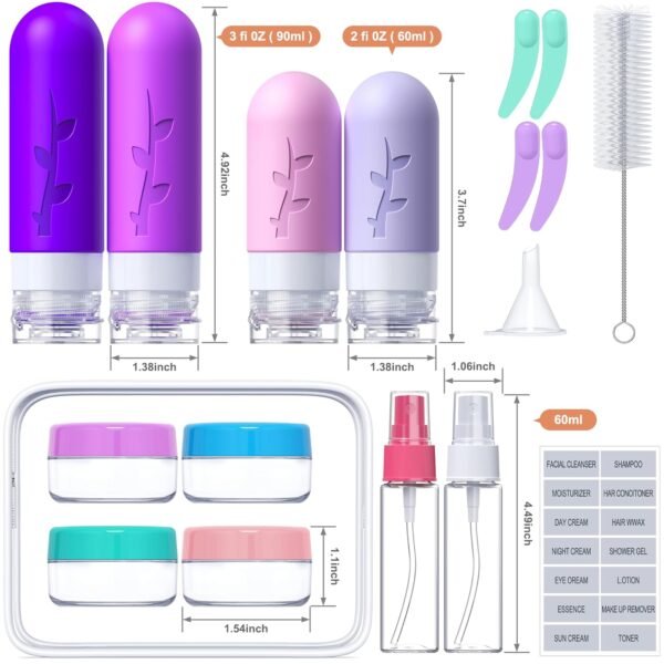 【18 pack travel Essentials 】Our 18 pack reusable travel bottles set with 1 waterproof bag, 2 pcs Leak poof silicone bottles (3 oz/90 ml), 2 pcs silicone bottles(2 oz/60 ml), 2 pcs spray bottles(1.05 oz/30 ml), 4 pcs cream jars(0.35 oz/10 ml), 1pcs funnels, labels, brush and 4 pcs spatula, different accessories for your different needs
