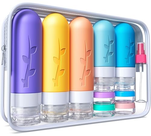Travel Essentials must have:Aeomni 19 pack travel size toiletries set includes 1 transparent waterproof storage bag, 3 large silicone travel bottles (3oz/90ml), 2 small silicone travel bottles (2oz/60ml), 2 spray bottles (1oz/30ml), 4 cream boxes (0.34oz/10ml), 1 funnel, 1 cosmetic label, 1 cleaning brush and 2 cosmetic spatulas. Enough to accommodate all your travel necessities!