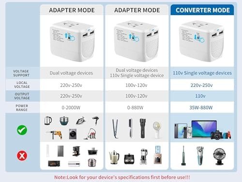 [220V to 110V Converter] – Power converter mode reduces the voltage from 220 – 240 V to 100 – 120 V, suitable for 26 – 880 W electrical products such as hair straighteners, laptops, curling irons and other devices, maximum power of 2000 W in 240 V adapter mode, ideal for dual voltage devices steam irons hair dryers, kettles, blenders and other devices.