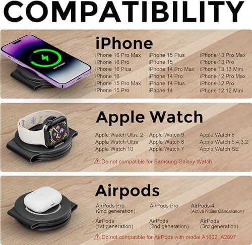 Fast Wireless Charging Station: This wireless charging station is specifically designed to be compatible for iPhone Airpods Apple Watch; With an 18 W quick charger, you can fully charge your device in just 2-3 hours. 3 in one charger for Apple Watch/iWatch/Airpods/iPhone 16 15 14,13,13Pro,13Pro Max,12,12 Pro,12Pro Max,12 Mini