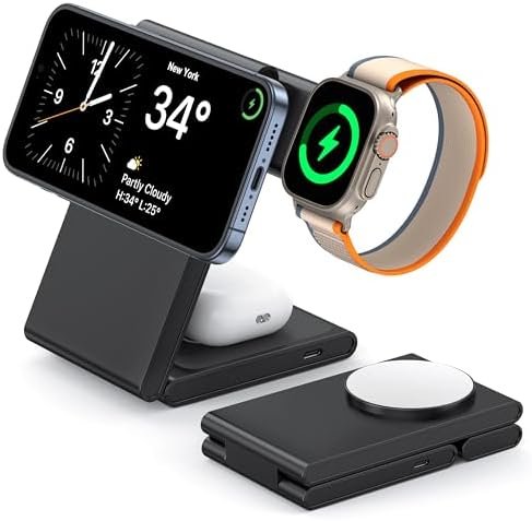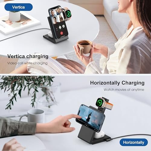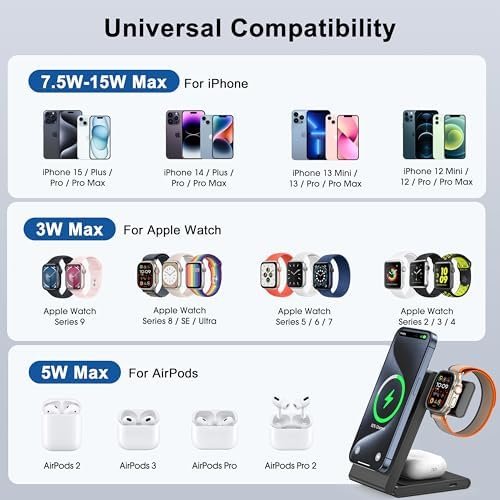 3-in-1 Charging Station: It’s an all-in-one wireless charging station for multiple devices. Now it’s just need one wireless charger for iPhone 15/14/13/12 Mini/Plus/Pro/Pro Max Series. It can act as a wireless charger for AirPods Pro 2/Pro/3 and AirPods 2 (with wireless charging case) and a magnetic wireless charger for Apple Watch S2-S9/SE/Ultra