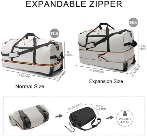 LARGE CAPACITY : Regular size:31.5″L x 14.2″H x 15″W.Capacity:110 L.Weight is 4.2 lb;Expanded size is 31.5″*14.2″*19″.Capacity:140 L;Folded size:15″*5″*7.9″