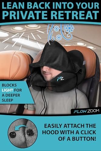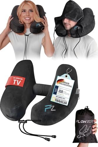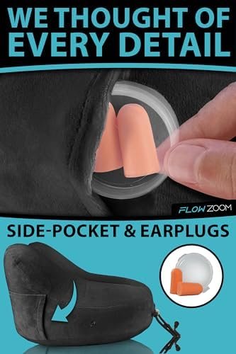 Swift Rest, Easy Pack: Discover our fast inflating travel neck pillow for airplanes! The travel set of airplane essentials includes a neck pillow with hood, earplugs and a handy bag.