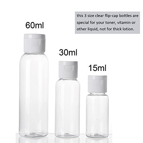 VARIETY OF BOTTLES TO MEET DIFFERENT NEEDS – one 60ml (2 oz. ) pump bottle, one 60ml (2 oz. ) flip-cap bottle, one 30ml (1 oz. ) spray bottle, one 30ml (1 oz. ) flip-cap bottle, one 15ml (0. 5 oz.) flip-cap bottle, one 30ml squeeze bottle, two 0. 5 oz. cream jars, two 0. 35 oz. cream jars, two 0. 1 oz. cream jars, one pipette, one funnel, one spatula, one zip pouch