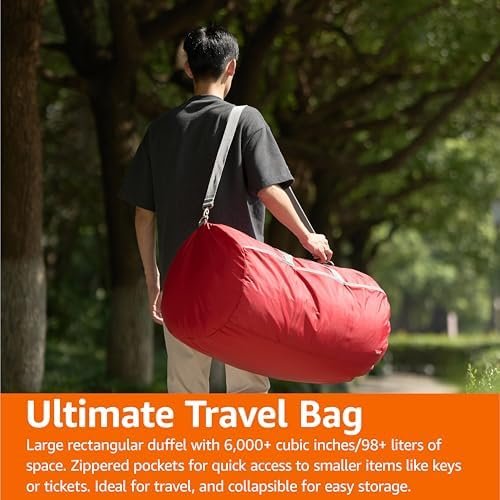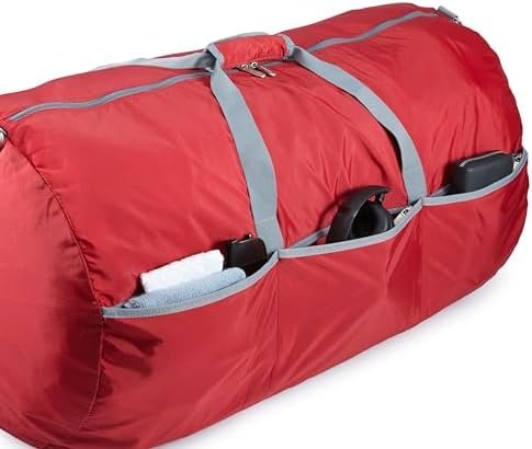Red, large rectangular-shaped duffel bag with roomy interior (over 6,000+ cubic inches); ideal for travel or storage