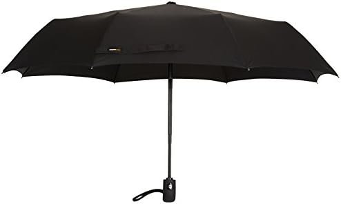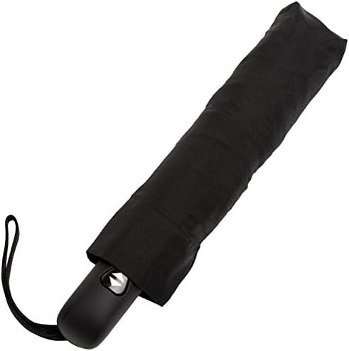 Black, full-size travel umbrella closes to a compact size