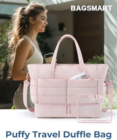 Large Capacity&Lightweight: BAGSMART travel puffer bag is crafted from soft, thick, and durable Taslon, which offers a comfortable carrying experience. Large duffle bag provides ample space and multiple compartments to efficiently organize your belongings. Dimensions: 18.9×8.5×15.5 inches