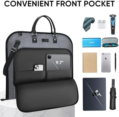 [Practical Design] This garment bag for suit is more than just a protective layer for your clothes. Its foldable design ensures that it compacts down efficiently, taking minimal storage space. Moreover, you can also store small items in the front pocket of the travel garment bag. The PU handle, complemented by an adjustable shoulder strap, ensures ease of transportation during travels.