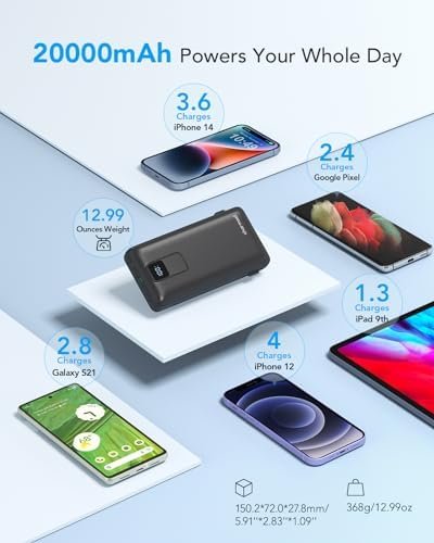 20000mAh Capacity: 20000mAh battery capacity provides 3.75 charges for iPhone 14 Pro Max, 3.87 charges for iPhone 13, 4.26 charges for iPhone 12, 1.55 Charges for iPad 10th generation, 2.4 charges for your Samsung Galaxy s22 ultra, 4.33 charges for your Google Pixel, One Plus 11 2.4 charges.