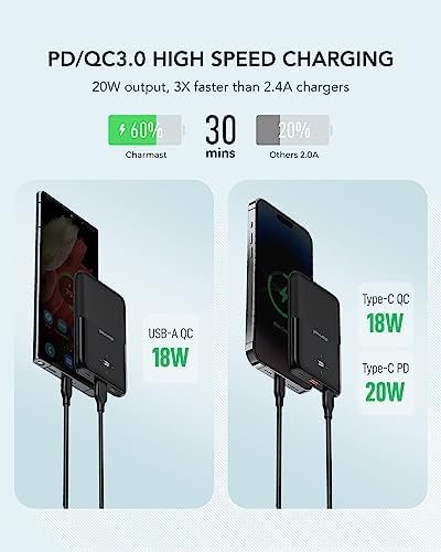 🔋Ultra-Compact Design: Charmast Small Portable Charger packs a powerful 10000mAh capacity into a sleek body measuring only 3.95″ x 2.63″ x 0.68″ and weighing just 5.85oz. Its compact size effortlessly fits into your pocket or bag, making it the perfect travel companion without adding any extra weight.