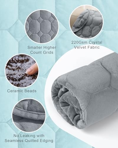 Snuggle-ease Weighted Design: This adults weighted blankets feature double-side crystal velvet with sublimely silky touch and refined texture, offering the best level of comfort. Enjoy deep touch pressure from as little as 0.03 inch glass beads evenly packed in 50 compact grids. It works like a charm for people with sleep problems. 7 layer design and seamless edging prevent beads rustling or leaking.