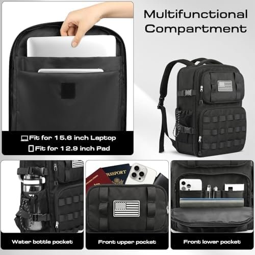 Roomy Capacity & Multi-Pocket: Tactical backpack has 3 main large compartments and 9 allocated inner and side pockets. Makes your item organized and easier to find. Backpack with laptop compartment holds a 15.6 inch laptop and a 12.9 inch iPad. Laptop backpack for men providing a dedicated space for your pens, textbooks, wallet, clothes, shoes, bottle and other travel essentials. At the same time, travel backpack carry on flight approved is slightly waterproof