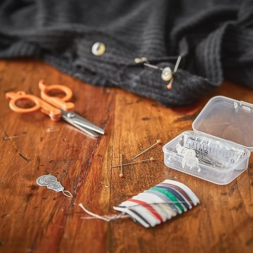 TRAVEL SEWING SET: TSA-compliant sewing set featuring folding travel scissors with durable, stainless steel blades, 10 colored threads 39″ measuring tape, 3 hand needles, 2 safety pins, 4 straight pins, 4 buttons, and a needle threader