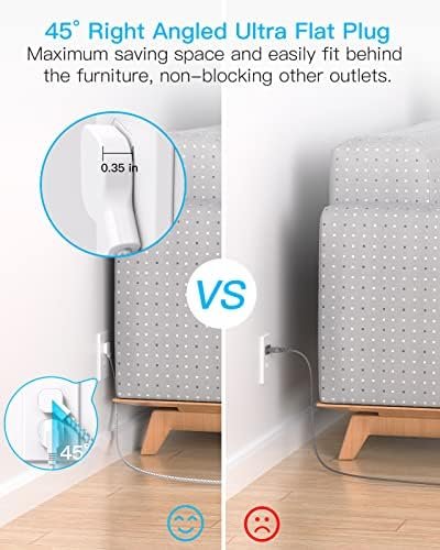 【Right Angle Ultra Flat Plug & 5 Ft Braided Extension Cord】 – With only 0.35 inch ultra thin plug and 45 degree right angle design, which is much slimmer than traditional plugs, can close to the wall easily and hide in the back of furniture, no waste for outlet and space. 3mm thicker extension cord is made of pure copper, which has better current carrying capacity (15A). The braided power cord is not easy to deform, durable and more safety.