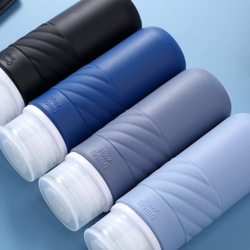 TSA carry on approval: 4 pack 3 oz silicone travel bottles, very suitable for shampoo, conditioner, shower gel, lotion, hand sanitizer and shower gel. It is equipped with a high-quality zipper transparent wash bag, which saves space and allows you to travel long distance freely like a professional.