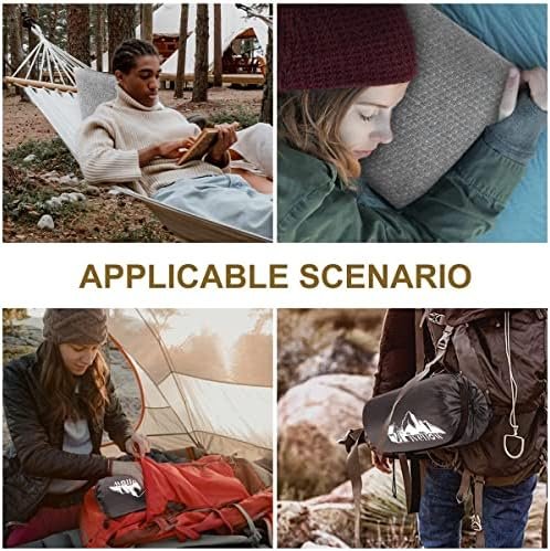 【Compact and Lightweight】our camping pillow is light weight and portable, with a 12” width and 16” length, comes in a practical travel bag, you can compress the pillow to save space and for easy travel or camp. Great for business travelers, campers, backpackers, works great with your sleeping bag.