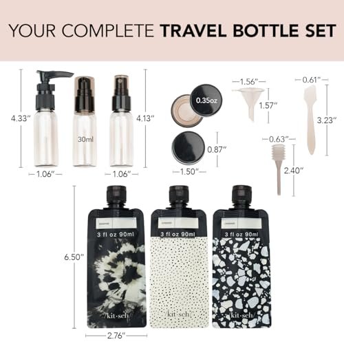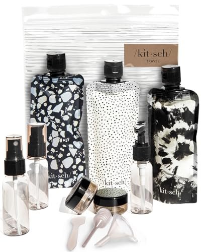 PORTABLE DESIGN: Compact and lightweight to pack in a purse, suitcase or overnight bag, the Kitsch tsa travel bottles for toiletries comes in a reusable travel pouch for easy storage to keep your beauty products located in an easily accessible and convenient place.