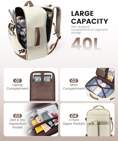 40L Capacity&3 Packing Cubes: Our travel backpack includes 3 packing cubes, large cube for your shoes, two medium cubes for your clothes and toiletries, these cubes keep your belongings neat and organized during your travel. With ample storage capacity and the benefit of the packing cubes, enjoy a stress-free and efficient packing experience.