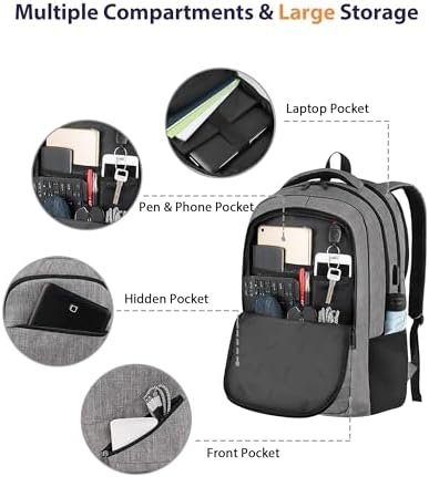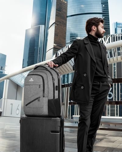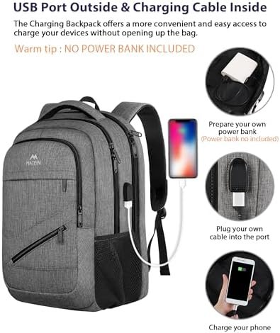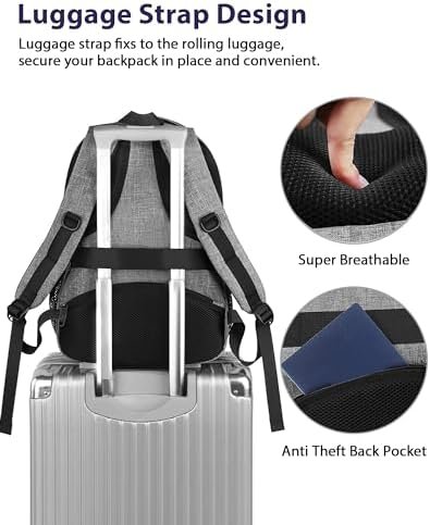 USB Charging Port and Luggage Sleeve: 17 inch sturdy computer backpack for men with external USB charger port and built in charging cable can conveniently charge your cell phone, tablet and other electronic devices while walking. Featuring the trolley belt on its breathable back, business traveler could fit large backpack right on the luggage suitcase, which free your hands
