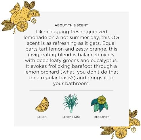 Scent: Lemon, Bergamot and Lemongrass. Freshens bathroom odors before it begins so you can leave the porcelain throne smelling better than you found it!