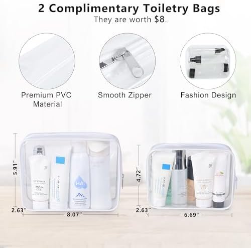 2 Complimentary Toiletry Bags: The package comes with two waterproof clear bags, measuring 8.07 x 5.91 x 2.36 inches and 6.69 x 4.72 x 2.36 inches. The clear bag stores the washing articles neatly and cleanly and has the advantages of convenient