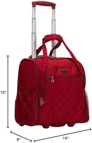 Carry all your essentials in style and comfort with the Rockland wheeled under seat carryon bag. Quilted polyester fabric exterior features a large main compartment for clothes, shoes and also has 2 slip pockets and two zippered pockets for keeping small essentials handy and organized. Retractable handle stores away while hand held handles allow for quickly grabbing bag from overhead bin or underneath seat. Back side has a strap allowing you to attach it to your wheeled carry on piece. This makes the perfect bag for overnight trips and the small size fits under near most airline seats allowing you to carry on your bag even when overhead bins are full.