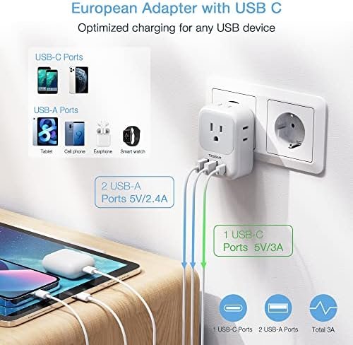 7 in 1 US to Europe plug adapter: It turns 1 European Type C socket into 4 American outlets and 3 USB ports(1 USB C) ; 4-side design can charge 7 devices at a time without blocking; You can charge devices with it anywhere like airports, hotels, office and dorm room