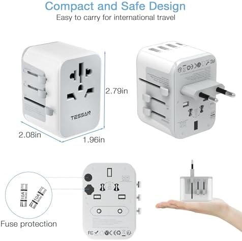 Portable and Safety: Compact and lightweight design to fit into luggage and briefcases; It has no surge protection, no cords, can be taken aboard cruise ship. The worldwide adapter with double fuse (fuse standard: 250V 10A), integrated security shutters, guard your travel security