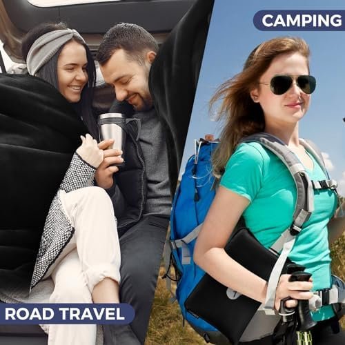 TRAVEL IN STYLE AND COMFORT: The Travel Blanket is made from 300 GSM premium microfleece polyester. Airplane blankets are lightweight, warm and plush.Travel blankets are thick enough to retain heat and keep you warm on long, chilly flights. Travel Essentials are perfect for travel, whether you are flying, camping, picnicking, beaching, or just relaxing in the great outdoors. This is a great option.