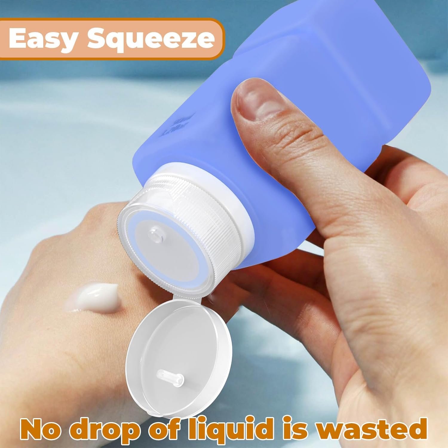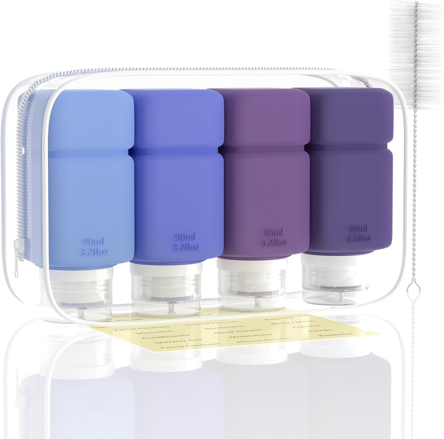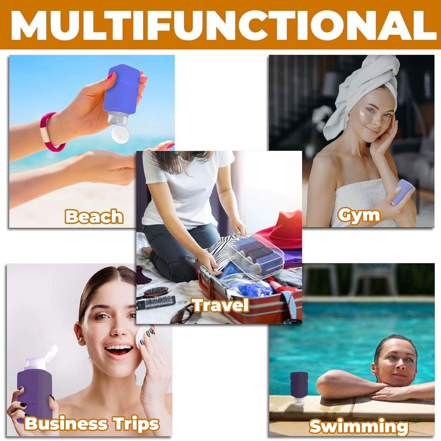 TSA APPROVED CAPACITY — Our travel size containers consists of a combination of 4 different colored 90ml silicone bottles, it perfectly meets the airline requirements and allows you to go through the security check without any obstacles. You can use it to hold your shampoo, body wash, mouthwash, etc. for traveling business trips to the gym, portable and not taking up much space.
