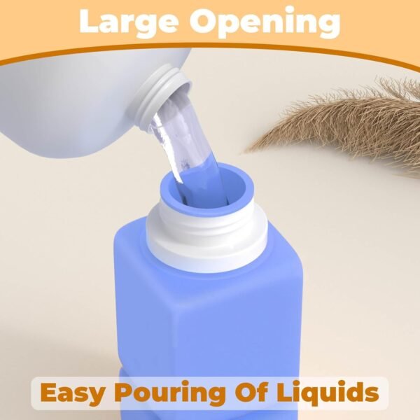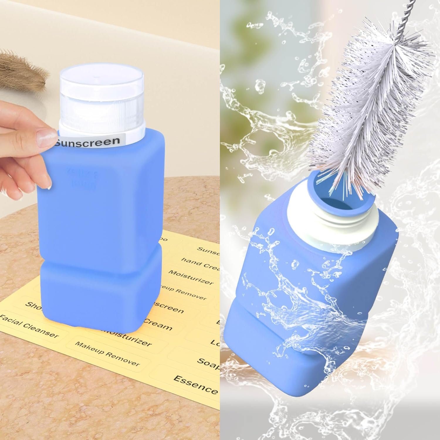 LABEL AND CLEANING BRUSH — The silicone travel bottles kit comes with a label that makes it easy for you to distinguish the liquid it contains. The dispenser bottle is designed with a large opening, which not only facilitates the inflow of thick liquids, but also facilitates the cleaning of the dispenser bottle. The cleaning brush we included makes cleaning easier and cleaner.