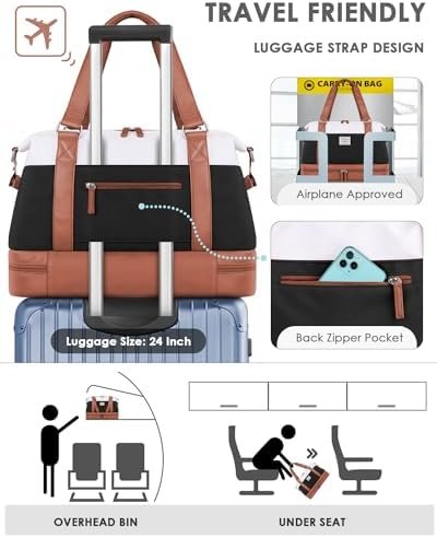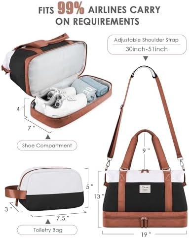 Fits 99% Airlines Carry On Requirements: The gym bag for women dimension is 19*7*13 inch, and conforms to 99% international carry-on baggage requirements. Fits in the overhead compartment as well as the under seat as personal items in flight. Has a trolley sleeve to fit over the luggage handle, saving effort and making it easy to move.