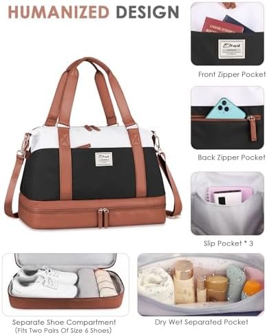 Large Capacity & Multiple Pockets: This travel duffle bag can fit in 2-3 days of daily essentials. Comes with a $10 toiletry bag to store cosmetics/toiletries. 8 pockets to keep your items organized, a spacious main compartment with 4 big pockets, and in the front and back of the travel bag, there is a pocket for easy access to phone, IDs or passport.