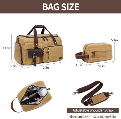 【Dimensions】Duffel Bag: 20(L)11.8(H)10.2(W)inch, Large capacity, can be used as a carry-on flight bag. Toiletry bag: 8.6(L)5.1(H)3.9(W)inch.