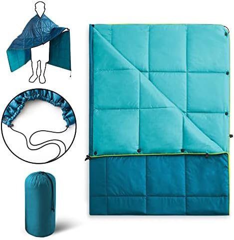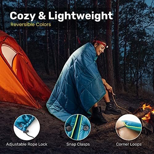 MULTIFUNCTIONAL – The ultralight packable down alternative puffy camping blanket have corner loops, buttons and elastic straps, this blanket can be used as quilt, poncho, shawl, temporary sleeping bag. allow you to stake the portable blanket into the ground, tent or RV.
