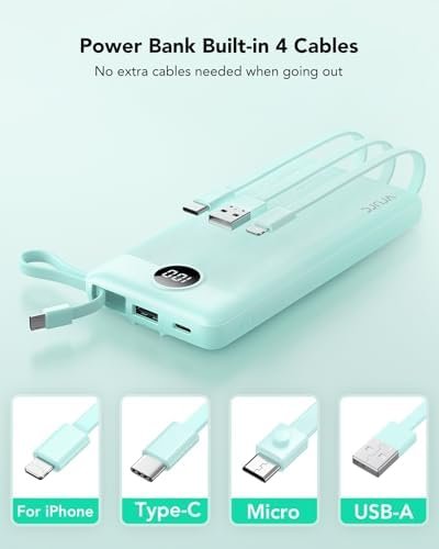 【Portable Charger Built-in 4 Cables】Built in cable compatible with iPhone,Samsung,Andriod and tablets etc smart devices,directly charging in anywhere,also built in USB cable for charging power bank itself,you don’t need take any cords when going out.