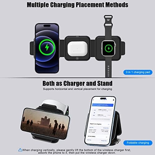 3 in 1 Foldable Wireless Charger: This 3 in 1 wireless charging station is equipped with an 18W fast charging adapter, USB-C charging cable and travel case. The charger can be adsorbed and folded into a phone stand to watch videos while charging; it also can fold to charge, or unfold the charger to charge your iPhone, iWatch and AirPods efficiently at the same time
