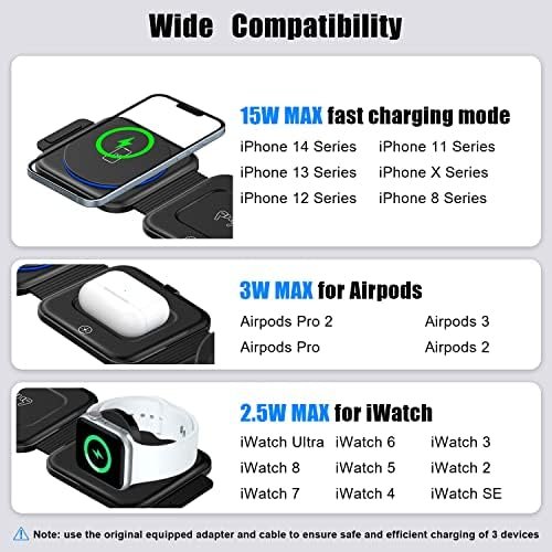 Wide Compatibility: haino 3 in 1 magnetic wireless charger is compatible with iPhone 14/14 Plus/14 Pro/14 Pro MAX/ 13/13 Mini/13 Pro/13 Pro MAX/12/12 Mini/12 Pro/12 Pro MAX/11/11 Pro/11 Pro Max/X/XR/XS/XS MAX/8/8 Plus, and can charge other phones that support wireless charging. It’s also for AirPods 3/2/Pro 2/Pro, iWatch Ultra/8/7/6/5/4/3/2/SE