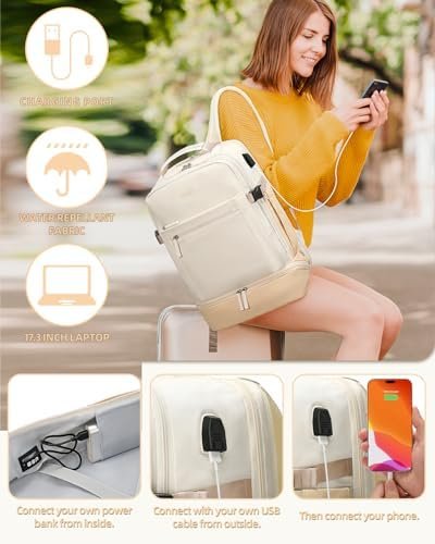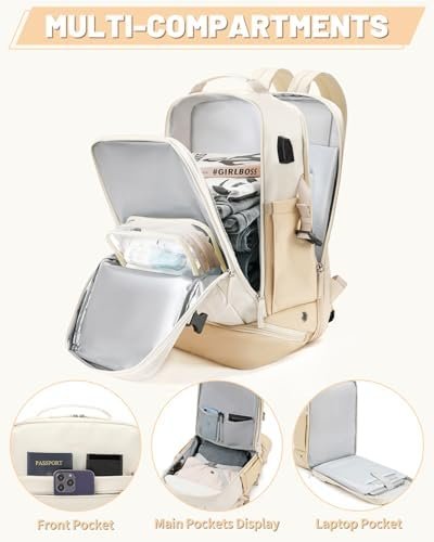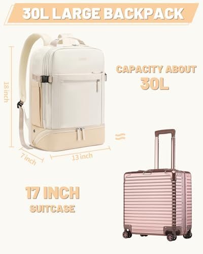 [Multi-pocket Backpack]-The Travel Backpack for Women is designed with Multi functional pocket for 2-3 days travel necessities, holds about 30L. One separate laptop compartment hold 17 Inch Laptop as well as 15 Inch,14 Inch and 13 Inch Laptop. Main compartment with large capacity and various poctets be used for 5-8pcs summer clothes, pens, wallet, and other items, making your items organized. The carry on backpack is perfect for airline travel, gym sessions, business trips, or everyday use